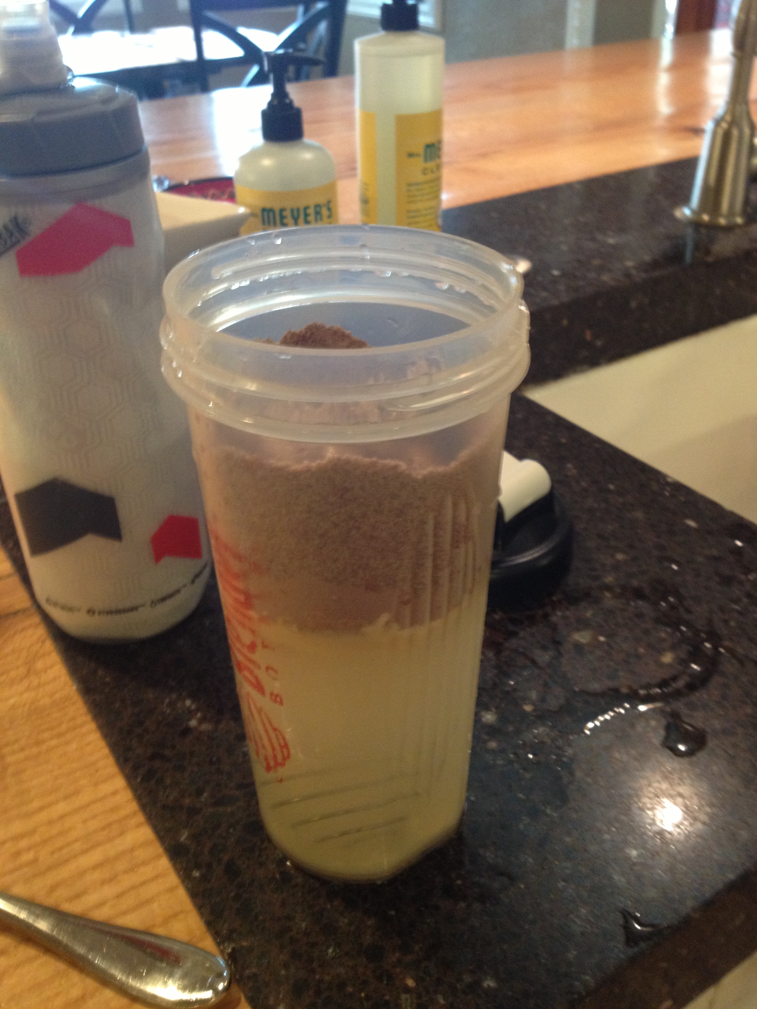 Protein Shake – Undenatured Whey Vanilla and Chocolate, Raw Organic Almond Butter, Honey, Raw Organic Flax Seed (a ton of it), 12 ounces of water…..and, a teaspoon of Cinnamon. Down the hatch and off to train with Kevin at Sky’s the Limit CrossFit.