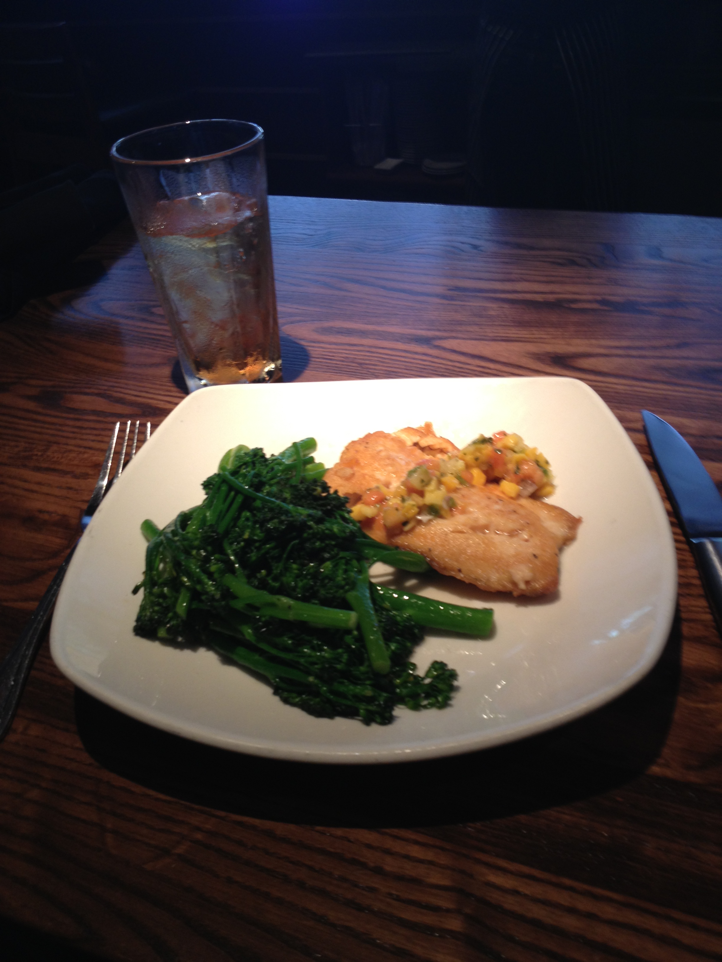 today (fish). And, I had them “86” the rice and give me a bunch of broccolini instead….sauteed in olive oil and butter, of course. Good Stuff.