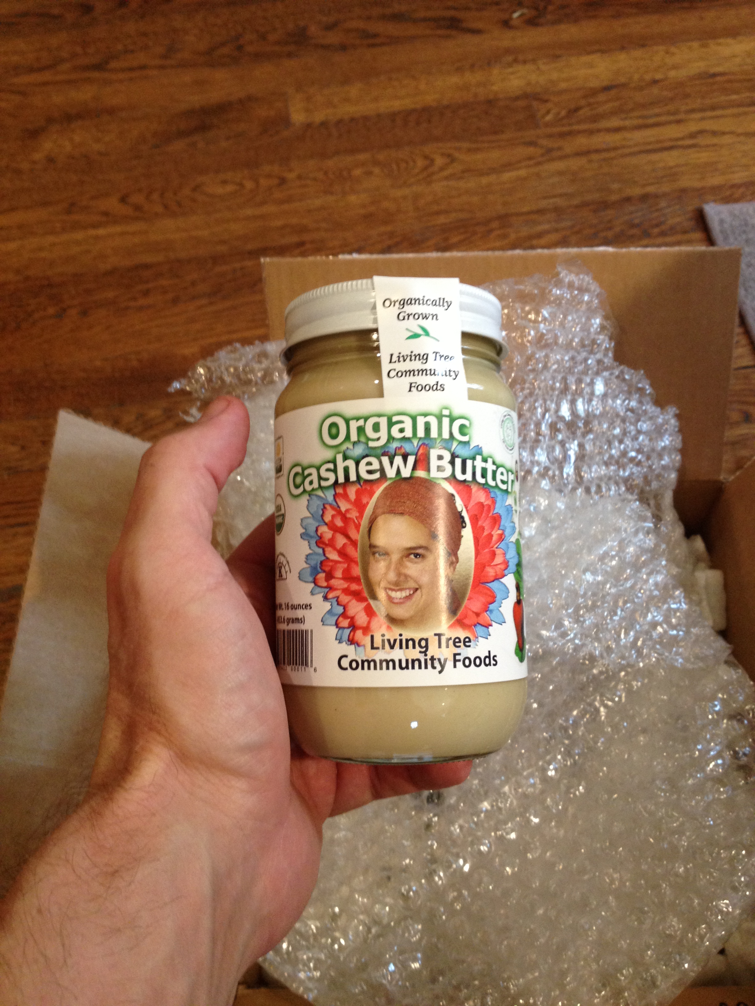 what he delivered? A box from Living Tree Community! 3 jars of Raw Organic Cashew Butter. (Why? Cuz Cashews are a unique source of Omega 9 fats…..you don’t get that in Almond Butter. You also don’t need as much of them as you do the Omega 3 heart savers that are in Almond Butter.) But, you do need some. So, I am going to start mixing in a little Cashew Butter with my Protein Shake mixture each time….just for that little