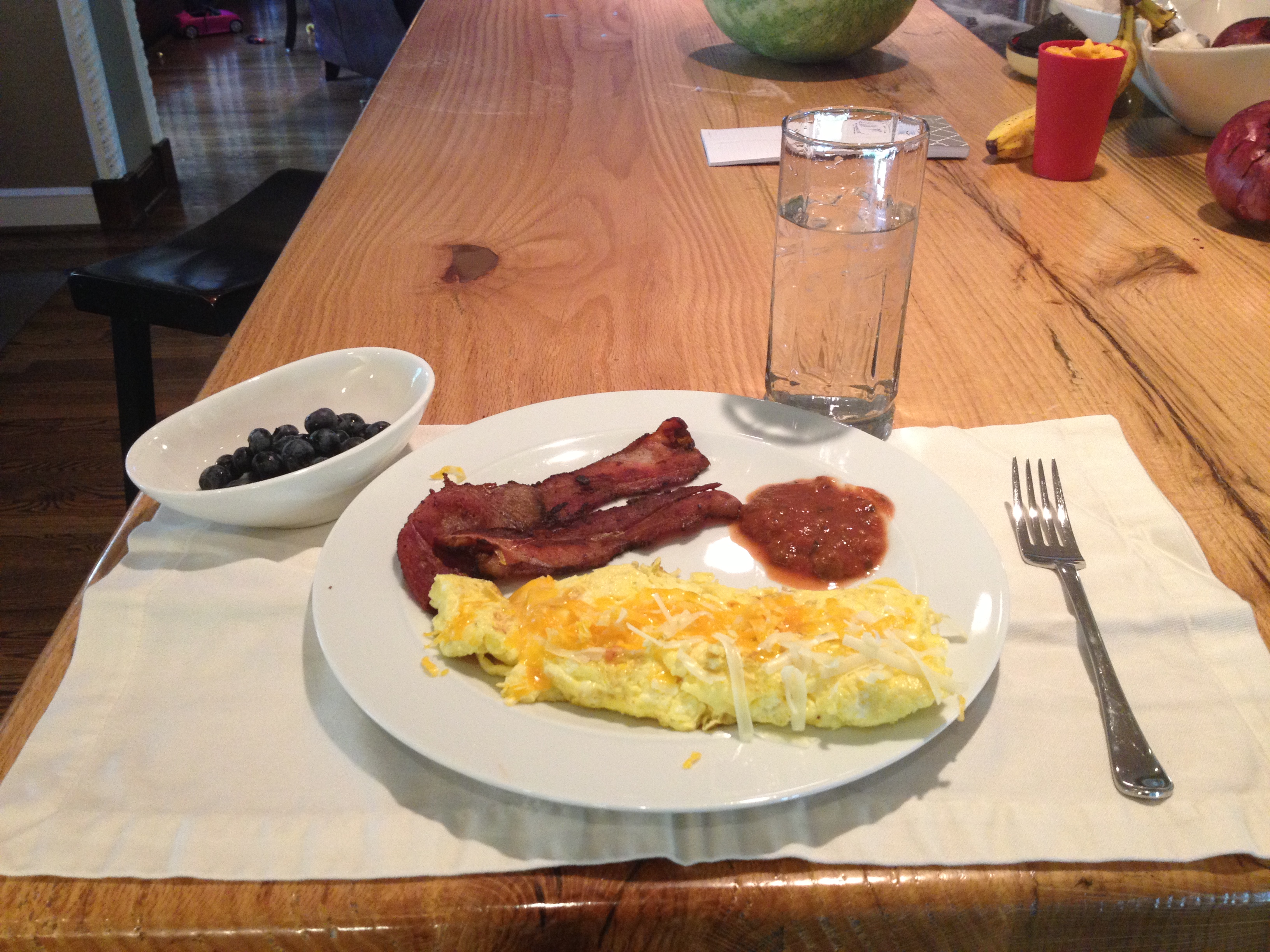 After the protein shake….and, a little bit of hanging around doing nothing with our girls….I decided it WAS time to make momma some food after all. But, without the help of the girls. But, as it happened, Angie had already beat me to the sauce pan. So, I let her prepare the eggs while I made some bacon…..about 6 pieces of Trader Joe Uncured