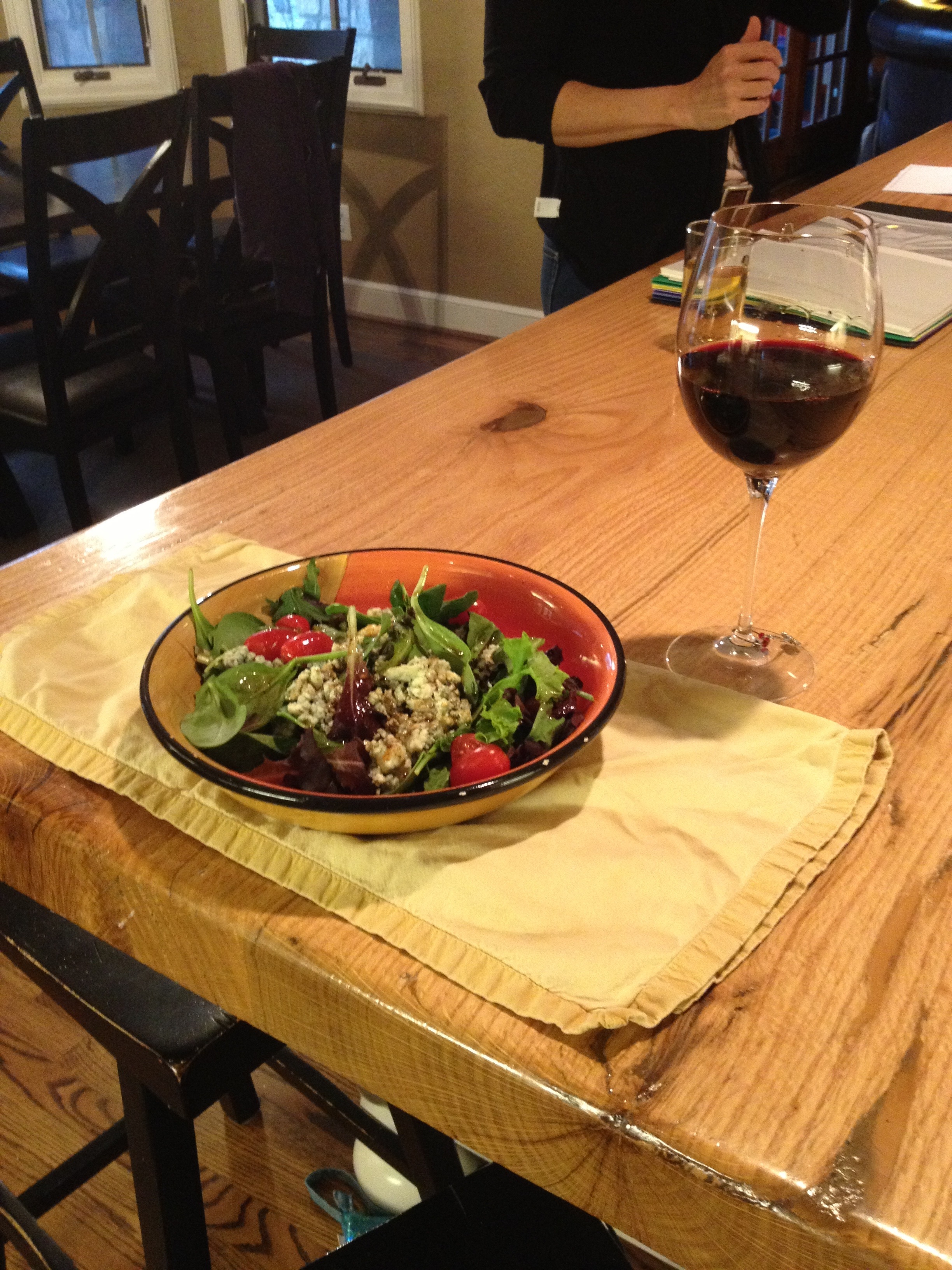 water thinking about its eventual entry into my mouth on its way to my eagerly waiting belly. As you may know, Angie cooks many things from scratch…and, I mean “scratch”. Chili is not an exception for her. She does not put anything in it that comes from a packet. Everything is fresh. And, the ingredient list is somewhere in the 25 to 30 range (of different items). It has some spice to it….although, in my opinion….not a ridiculous amount. And, as luck would have it, she purposefully made too much of it at its last brewing. And, today was the lucky day that we got to eat that which she had frozen. Before that could go down the chute, I was treated to one of her fresh organic field greens salads with organic baby tomatoes and blue cheese…and, her home made